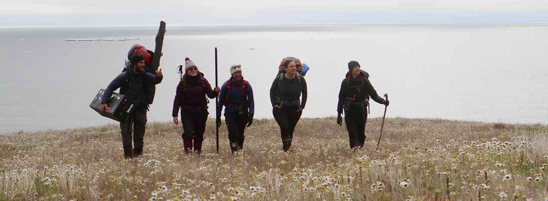 The Arctic Crew of Team Shrub lands on the island on the 26th July 2024 as the Alfred Wegener Institute Crew leaves the island. Photo by Isla Myers-Smith.