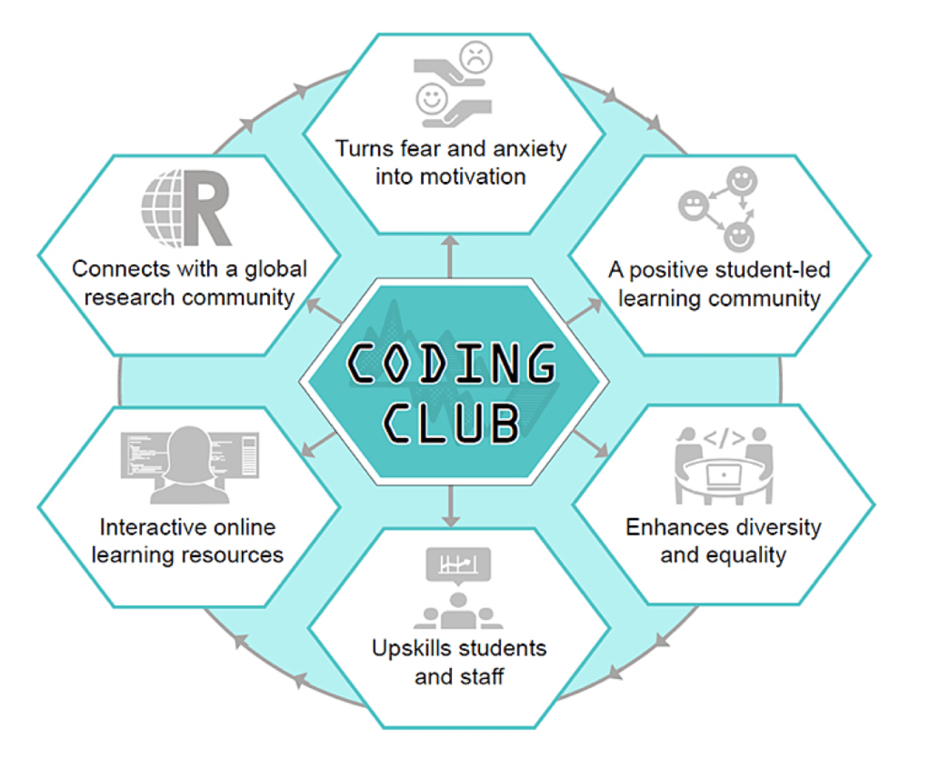 Coding Club is a peer-to-peer teaching scheme for computer coding and quantitative skills. Coding Club encourages statistical training and the surmounting of statistics anxiety – worry about a lack of quantitative skills – and code fear – the fear of programming. It is a peer-to-peer teaching initiative where attendees are trained in quantitative skills by PhD and undergraduate students and then mentored to share these skills to their fellow students through a series of informal workshops on a variety of quantitative skills topics at different levels. Coding Club was the winner of the University of Edinburgh 2017 Impact Award for best student staff collaboration.